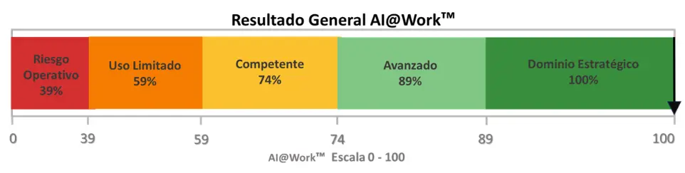 A diferencia de otros tests de “conocimiento en IA”, AI@Work™ no evalúa teoría, programación ni moda tecnológica. Evalúa lo que realmente importa en una organización moderna: